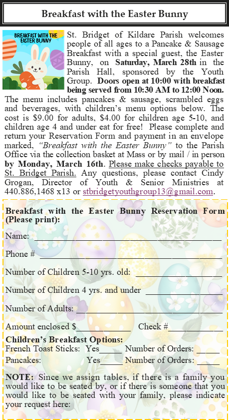 Please complete and return your form and payment in an envelope marked, “Breakfast with the Easter Bunny” to the Parish Office via the collection basket at Mass or by mail/in person by Monday, March 16th. Please make checks payable to St. Bridget Parish. Any questions, please contact Cindy Grogan, Director of Youth & Senior Ministries at 440.886,1468 x13 or stbridgetyouthgroup13@gmail.com.
