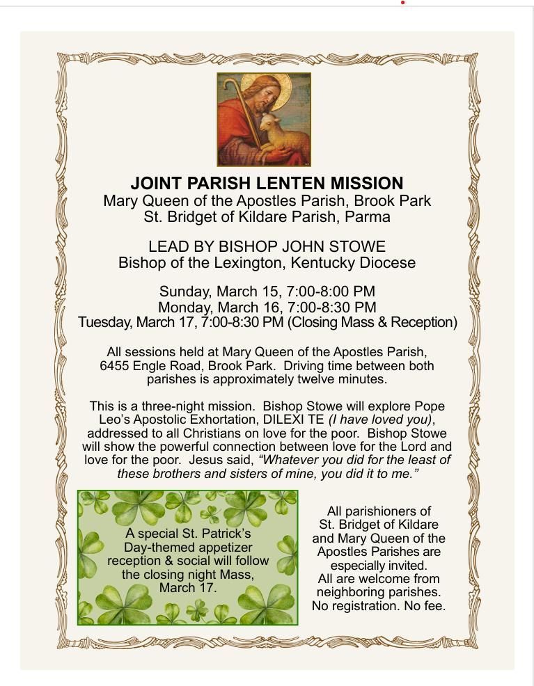 Breakfast with the Easter Bunny, Saturday, March 28th: St. Bridget of Kildare Parish welcomes people of all ages to a Pancake & Sausage Breakfast with a special guest, the Easter Bunny, on Saturday, March 28th in the Parish Hall, sponsored by the Youth Group.